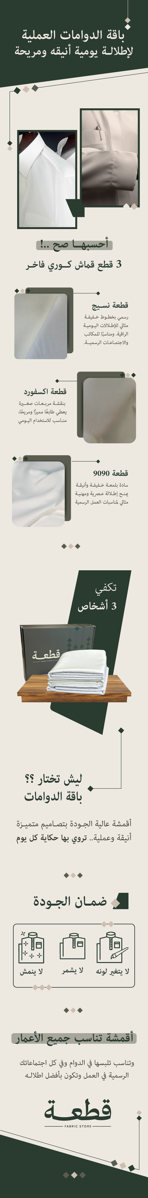 - قطعة ربع واقف ( مقاوم للتجاعيد بنسبة كبيرة ) قماش بارد وعملي ومريح جداً.